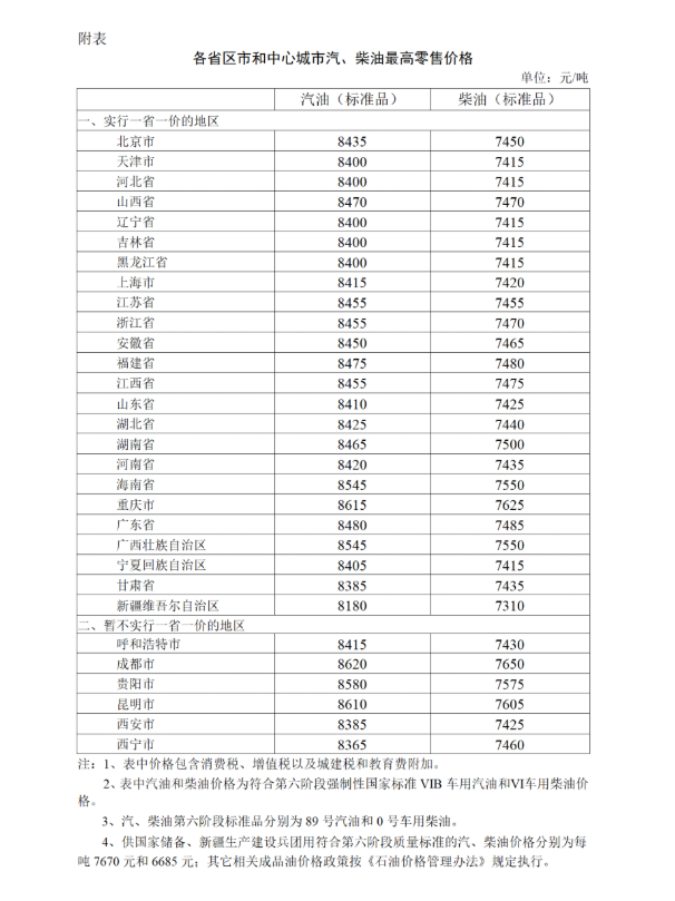 近期國際市場油價波動上升,根據1月20日的前10個工作日平均價格與上次調價前10個工作日平均價格對比情況,按照現行成品油價格機制,自1月20日24時起,中國汽、柴油價格(標準品,下同)每噸均上漲85元。調整后,各省(區、市)和中心城市汽、柴油最高零售價格見附表。