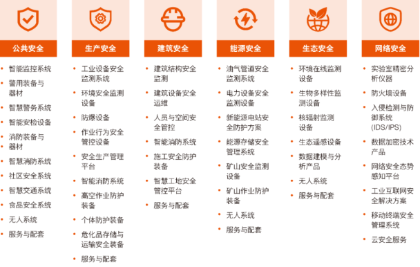 生產(chǎn)安全: 工業(yè)設(shè)備安全監(jiān)測系統(tǒng)、環(huán)境安全監(jiān)測設(shè)備、防爆設(shè)備、作業(yè)行為安全管控設(shè)備、安全生產(chǎn)管理平臺、智能消防系統(tǒng)、高空作業(yè)防護(hù)裝備、個(gè)體防護(hù)裝備、危化品存儲與運(yùn)輸安全裝備、服務(wù)與配套