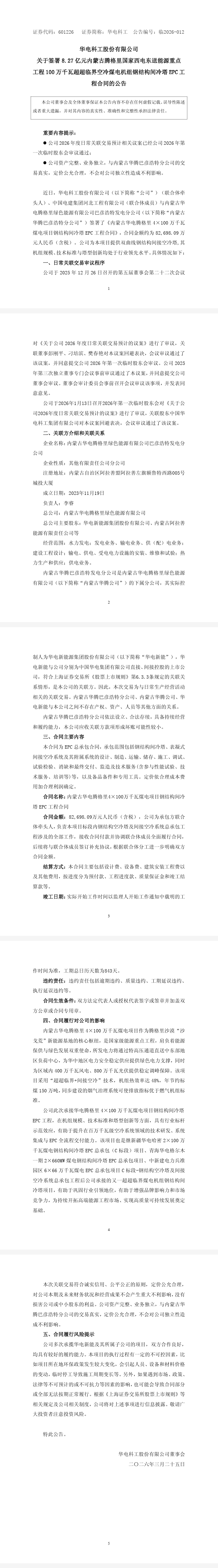 3月24日,華電科工發布公告稱,公司(聯合體牽頭人)、中國電建集團河北工程有限公司(聯合體成員)與內蒙古華電騰格里綠色能源有限公司巴彥浩特發電分公司簽署了《內蒙古華電騰格里4×100萬千瓦煤電項目鋼結構間冷塔EPC工程合同》,合同金額約為8.27億元(含稅)。公司為本項目提供雙曲線鋼結構間接空冷塔,其機組規模、技術標準與塔型創新均處于行業領先水平。