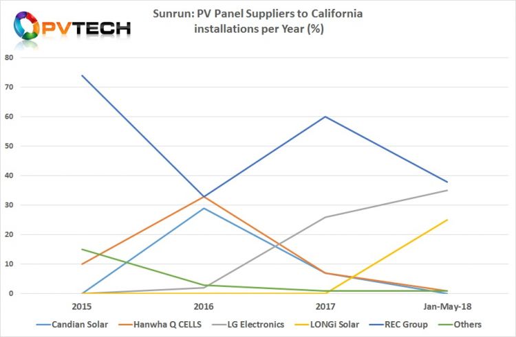 LONGi Solar于2018年初開始作為Sunrun的新供應商,2018年前四個月的平均份額達到25%。