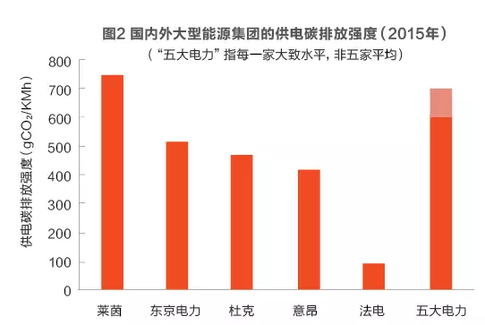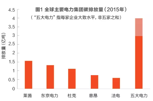 全球主要發(fā)電集團,包括法國電力(EDF)、意昂集團(E.ON)、杜克能源(Duke Energy)、萊茵集團(RWE)、東京電力(TEPCO),2015年各自碳排放總量大約在0.5~1.5億噸二氧化碳當(dāng)量的水平,同期中國的五大發(fā)電集團,每一家的碳排放總量均在3~4億噸二氧化碳當(dāng)量的水平(圖1),遠高于全球主要發(fā)電集團的水平,相當(dāng)于一個中等規(guī)模的發(fā)達國家的排放量(如英國),在排放量上可謂“富可敵國”。