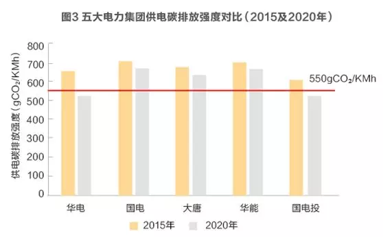 2016年發(fā)布的《“十三五”控制溫室氣體排放工作方案》要求2020年大型發(fā)電集團單位供電二氧化碳排放控制在550克二氧化碳/千瓦時以內(nèi),根據(jù)對五大發(fā)電集團已經(jīng)公開的“十三五”規(guī)劃部分數(shù)據(jù)進行測算,預(yù)計兩家有望完成指標(biāo)要求(國電投、華電),另外三家需要付出艱巨的努力,但能否完成仍然不容樂觀(圖3)。此外,《電力發(fā)展“十三五”規(guī)劃(2016-2020年)》同時提出,30萬千瓦級以上具備條件的燃煤機組全部實現(xiàn)超低排放,煤電機組二氧化碳排放強度下降到865克/千瓦時左右的目標(biāo)。