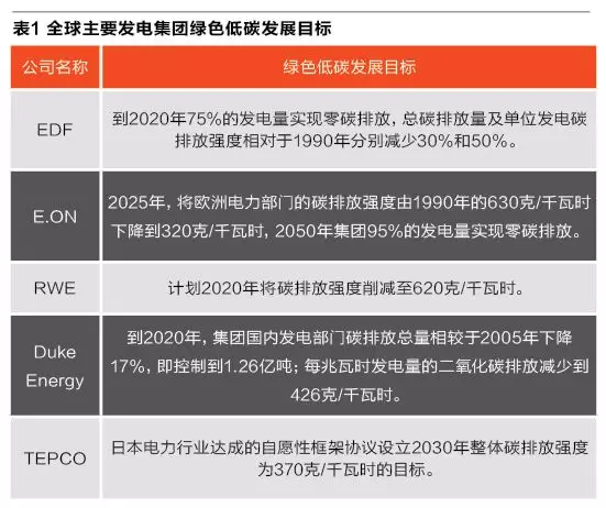 ?第二,規(guī)劃引領(lǐng),確立以“碳”為統(tǒng)領(lǐng)的發(fā)展目標(biāo)。落實碳排放管理,推行以“碳”為統(tǒng)領(lǐng)的發(fā)展目標(biāo)必須成為發(fā)電集團實現(xiàn)總體戰(zhàn)略目標(biāo)的重要抓手。目前,全球主要發(fā)電集團均確立了各自的碳排放控制目標(biāo)(表1)。中國大型發(fā)電集團也不甘落后,以華能集團為例,早在2010年的《華能集團綠色發(fā)展行動計劃》中,即提出到2020年集團供電碳排放強度降至525gCO/KWh(目前看來,這個指標(biāo)完成的難度不小)、清潔能源裝機達到35%的低碳發(fā)展目標(biāo)。華電集團在2017年集團年度工作會議上,提出到2020年單位電能碳排放指標(biāo)較“十二五”末降低20%、單位電能化石能源消耗降低20克的低碳發(fā)展目標(biāo),引領(lǐng)集團低碳發(fā)展新方向。