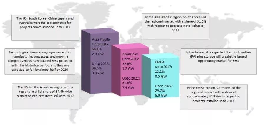 其他市場區域,例如非洲,中東和拉丁美洲等,僅有很少的實際存在的電池儲能項目。據預測,全球范圍內各國可再生能源的迅速普及,將有助于刺激儲能的應用。未來光伏加儲能可能會為電池儲能系統創造最大的市場機會。